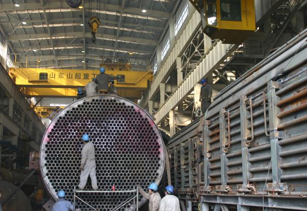 查看詳情 >2011年元月3日,機(jī)械制造公司員工們?cè)趯挸髁恋膹S房?jī)?nèi)施工,制造加氫反應(yīng)器。2010年機(jī)械制造公司自行投資興建了制造面積達(dá)10000平方米的千噸級(jí)高壓重型容器車間。...